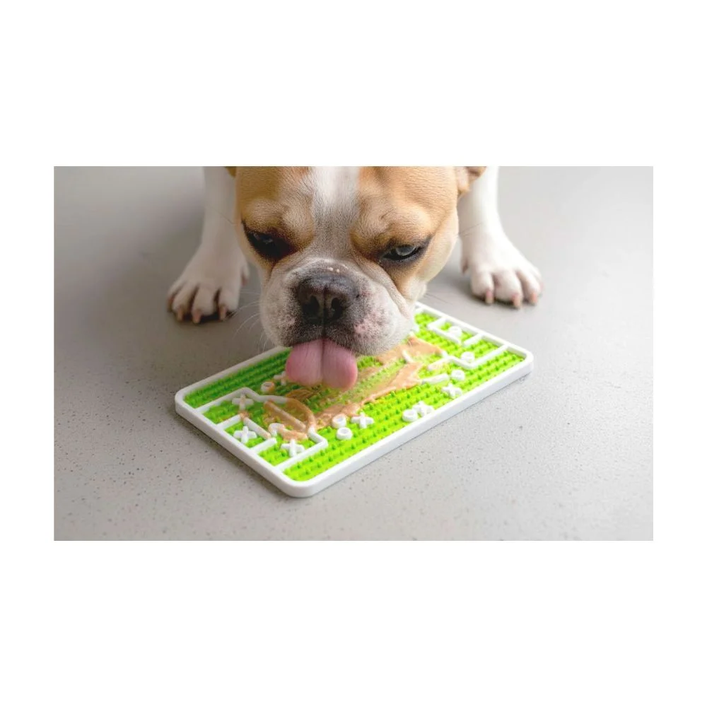 Haz que la hora del snack sea más divertida y relajante para tu mascota con este tapete temático de fútbol, ideal para estimular una alimentación más pausada.